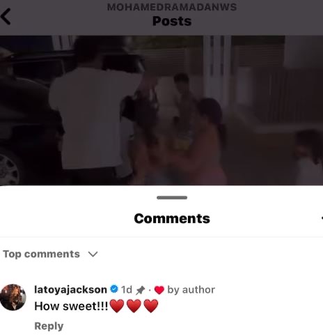 وكتبت لاتويا جاكسون، شقيقة النجم الراحل مايكل جاكسون على منشور محمد رمضان قائلة: " كم هو لطيف!".