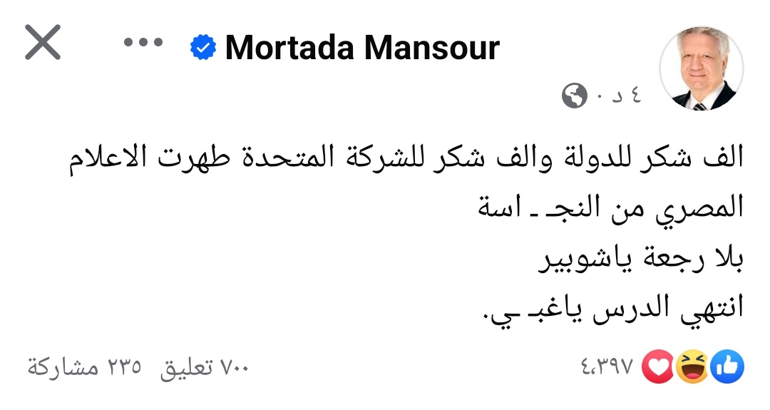 وقال مرتضى في منشور عبر صفحته الرسمية على موقع التواصل الاجتماعي فيس بوك: "ألف شكر للدولة وألف شكر للشركة المتحدة، طهرت الإعلام المصري، بلا رجعة يا شوبير".