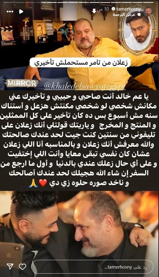 واختتم تامر رسالته لخالد الصاوي قائلًا: "وبالمناسبه أنا اللي زعلان عشان كان نفسي تبقى معايا وأنت اللي اختفيت وعلى أي حال زعلك عندي بالدنيا وأول ما أرجع من السفر إن شاء الله هجيلك لحد عندك أصالحك وناخد صورة حلوة".