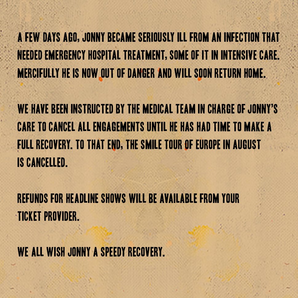 وأضاف:"تحقيقًا لهذه الغاية ، تم إلغاء جولة The Smile في أوروبا في أغسطس، نتمنى جميعا لجوني الشفاء العاجل، ولم ترد تفاصيل أخرى عن إصابته بالعدوى.