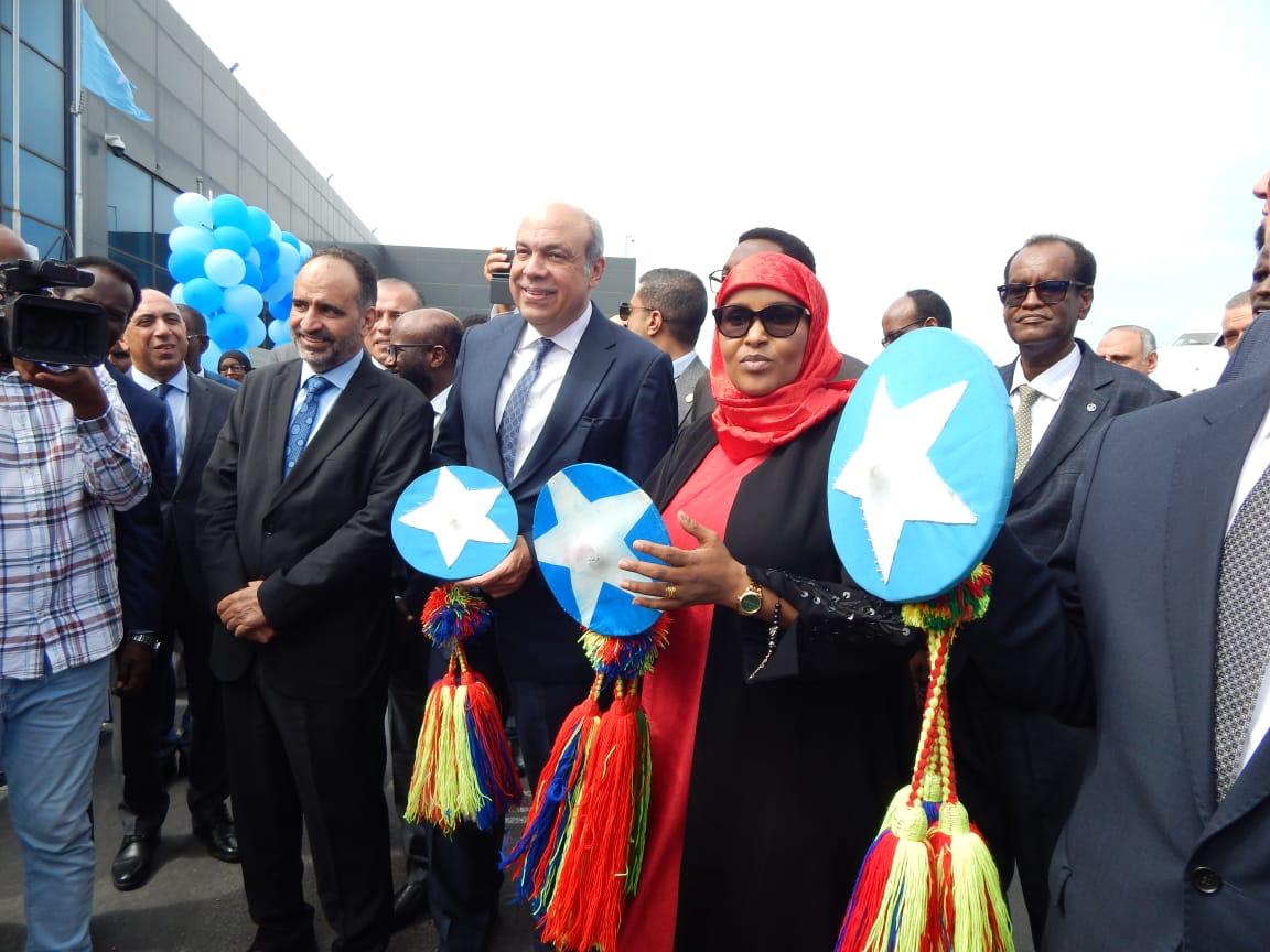 وعلى صعيد متصل،، توجه الوفد المصري إلى العاصمة الصومالية مقديشو، وكان فى استقبالهم السيد / أحمد معلم فقى، وزير الخارجية والتعاون الدولي بالصومال، والسيدة/ فردوسة عثمان، وزيرة النقل والطيران المدني، والسفير/ على عبدى أوارى، سفير الصومال لدى مصر، والمندوب الدائم لدى جامعة الدول العربية، ولفيف من قيادات المطار بدولة الصومال، هذا وقد شهدت مراسم استقبال الطائرة أيضًا تقليد رش المياه وأنغام الموسيقى الصومالية، في إشارة رمزية إلى الترحيب بالطائرة الجديدة وتفاؤلًا بنجاح هذا الخط الجوي الجديد.