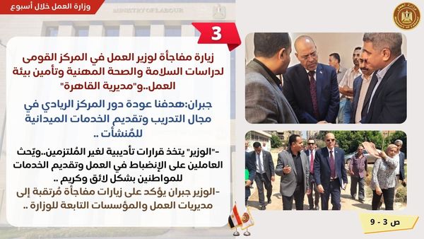 وكذلك توجيهات بتكثيف التواصل مع شركاء العمل والتنمية في الداخل والخارج ..كما قام الوزير بزيارة مفاجأة إلى المركز القومي للسلامة والصحة المهنية.