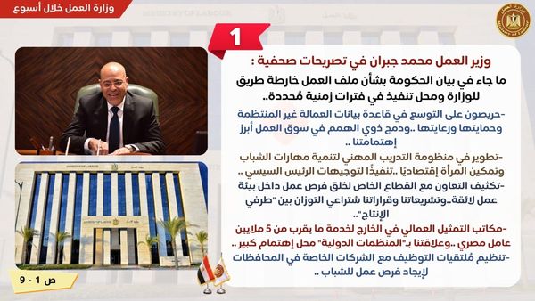 أصدرت وزارة العمل ،اليوم السبت، "إنفوجرافًا" يوضح نشاط "الوزارة" خلال أسبوع، وفيه تصريحات مهمة لوزير العمل محمد جبران تؤكد أن ما جاء في بيان الحكومة الجديدة بشأن ملف العمل، خارطة طريق للوزارة خلال الفترة المقبلة، تطورات جديدة في ملف العمالة غير المنتظمة.
