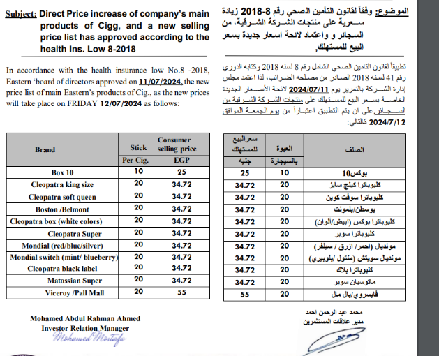 كانت أسعار منتجات شركة الشرقية للدخان، ارتفعت في مايو الماضي، وذلك تنفيذًا لأحكام ضريبة القيمة المضافة وتعديلاته، وقانون نظام التأمين الصحي الشامل رقم 2 لسنة 2018.
