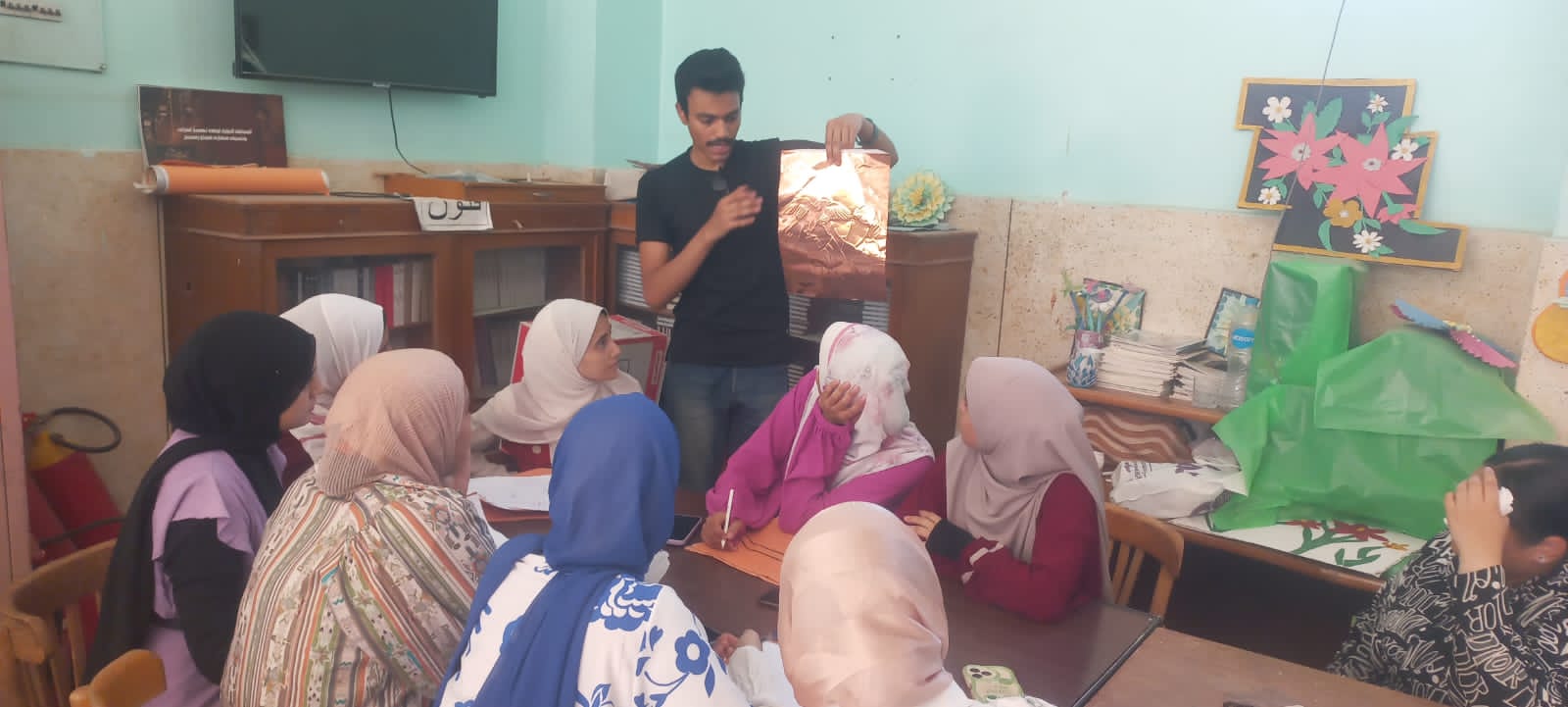 وفى ورشة "الطرق على النحاس" قام الفنان جلال عبد الخالق، بشرح اللوحة من حيث الخلفية الثقافية، وكيفية نقل الرسومات من على الورق ولصقها على النحاس، وشرح تقنية الغائر.