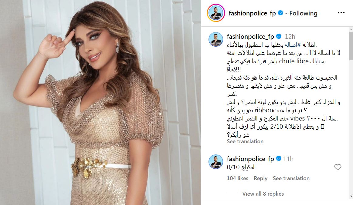 وبرغم أن البعض أبدى إعجابه بإطلالتها، إلا أن شرطة الموضة كان لها رأي آخر، فنشرت عبر حسابها الرسمي بموقع تبادل الصور والفيديوهات إنستجرام، بعض اللقطات لأصالة وكتبت: " إطلالة أصالة بحفلها بـ إسطنبول بهالأثناء.. لا يا أصالة لاااا.. من بعد ما عودتينا على إطلالات أنيقة بآخر فترة ما فيكي تعملي chute libre باستايلك فجأة !".