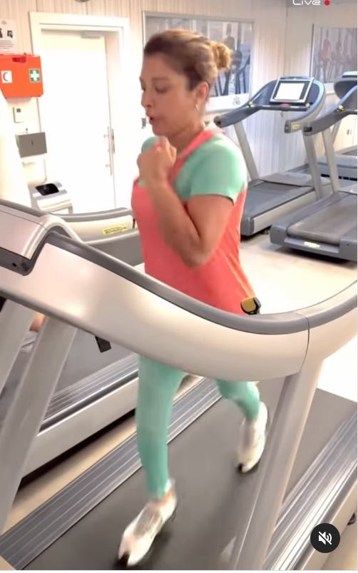 وظهرت أصالة نصري، وهي تجري على جهاز بالجيم بطريقة سريعة وشاقة، لتحافظ على رشاقتها خلال الظهور أمام جمهورها.