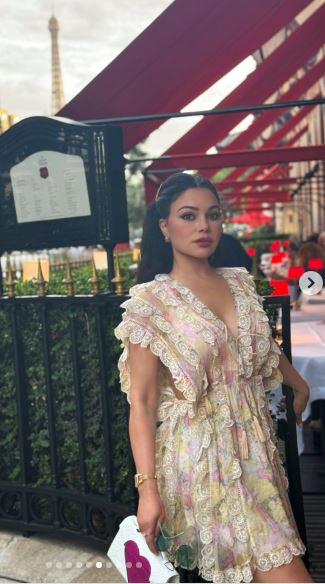 وأكملت رقي إطلالتها بحقيبة يد صممت من الجلد الطبيعي باللون الأبيض وتزينت ببعض الأكسسوارات الشبابية مع ساعة اليد الذهبية.