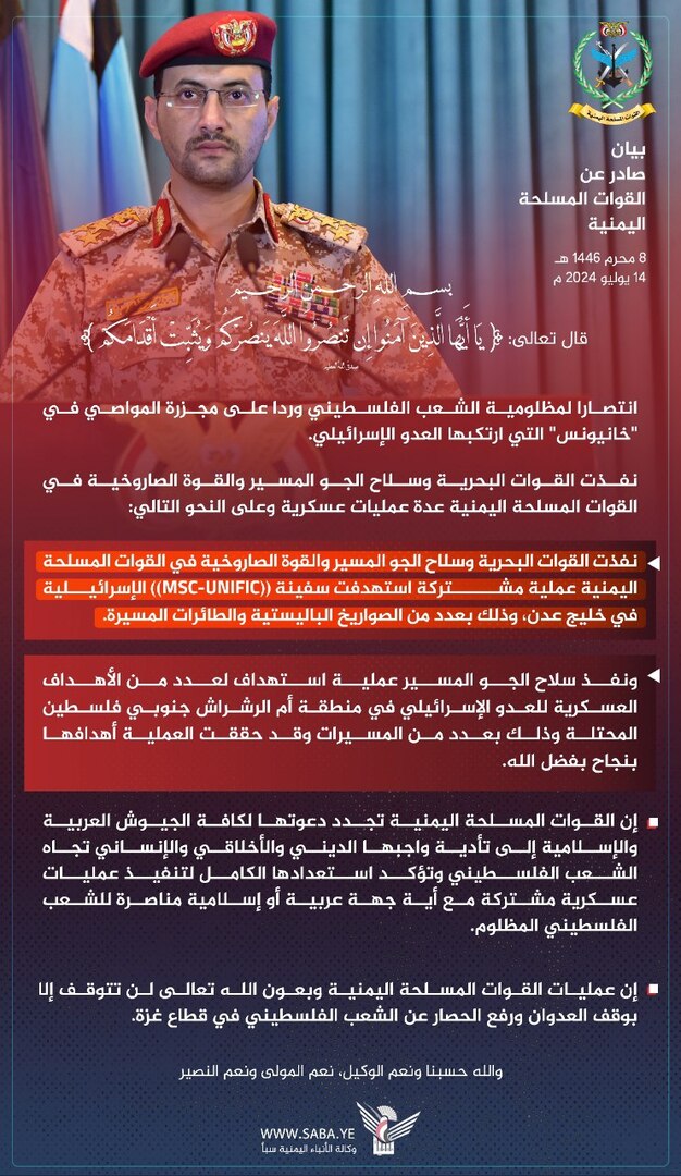 وقال المتحدث العميد يحيى سريع في بيان مصور: "انتصارا لمظلومية الشعب الفلسطيني وردا على مجزرة المواصي في خان يونس، نفذت القوات البحرية وسلاح الجو المسير والقوة الصاروخية في القوات المسلحة اليمنية عملية مشتركة استهدفت سفينة "MSC UNIFIC" الإسرائيلية في خليج عدن بعدد من الصواريخ الباليستية والطائرات المسيرة.