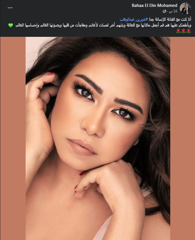 وكتب بهاء الدين محمد: "أنا كنت مع الفنانة الإنسانة جدا شيرين عبد الوهاب وبطمنكم عليها هي في أجمل حالاتها مع العائلة وبتنهى أخر لمسات لأغانى ومفاجآت من قلبها وبصوتها الغالى وإحساسها العالى".