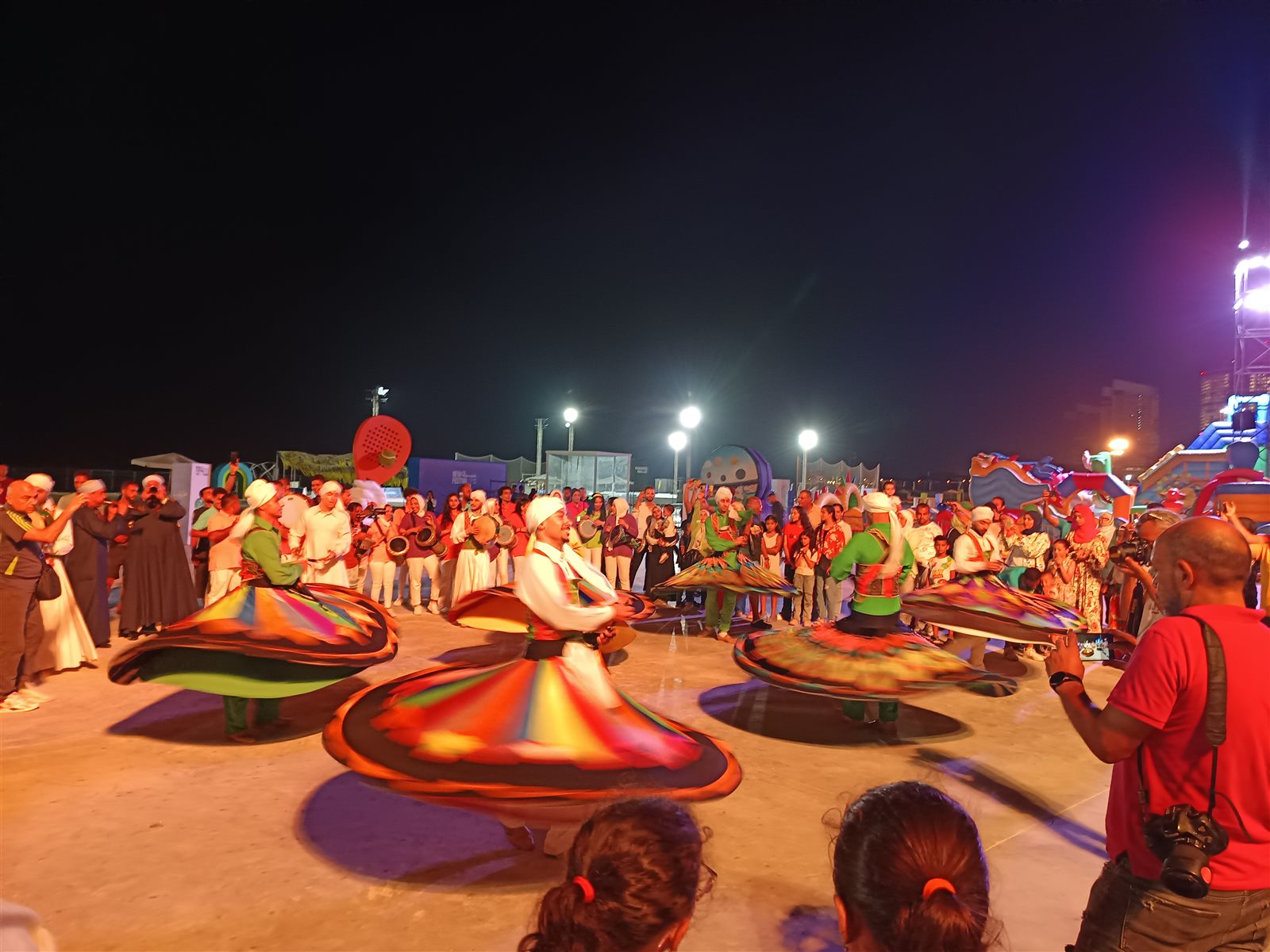 ووسط تفاعل من الأطفال والكبار، قدمت فرقة التنورة التراثية بقيادة محمد صلاح مجموعة من الاستعراضات الفنية على آلات المزمار والطبول، منها ديفيله المولد، واستعراض التنورة.