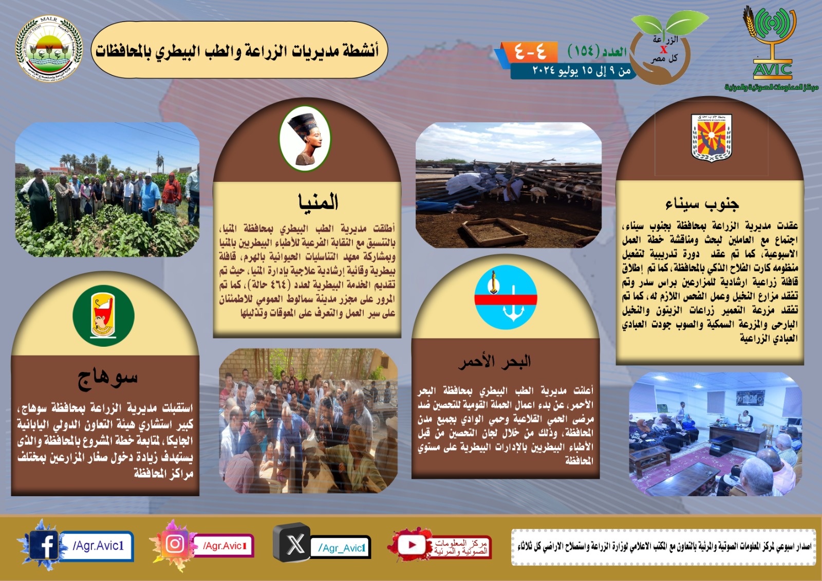 أصدر مركز المعلومات الصوتية والمرئية التابع لوزارة الزراعة واستصلاح الأراضي، والمكتب الاعلامي للوزارة، العدد رقم 154 من اصدار: "الزراعة في كل مصر" بالانفوجراف والفيديو، يوضح الجهود والانشطة التي تقوم بها مديريات الزراعة والطب البيطري بمحافظات الجمهورية خلال الفترة من 9 وحتى 15 يوليو الجاري.