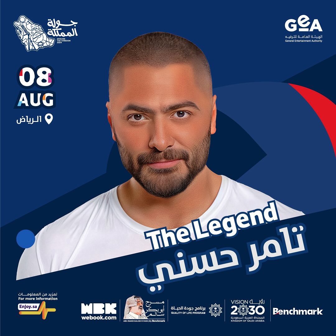 كما يستعد تامر حسني لإحياء أمسية استثنائية يوم 8 أغسطس المقبل على خشبة مسرح أبو بكر سالم بالمملكة العربية السعودية.