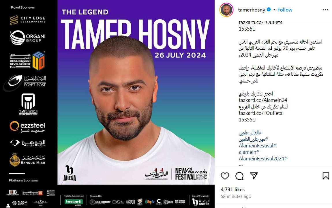 يستعد نجم الجيل الفنان تامر حسني، لإحياء حفلًا غنائيًا يوم 26 يوليو على خشبة مسرح أرينا، وذلك ضمن فعاليات مهرجان العلمين 2024 في نسخته الثانية، إذ مقرر أن يقدم مجموعة متنوعة من ألمع أغانيه القديمة والحديثة .