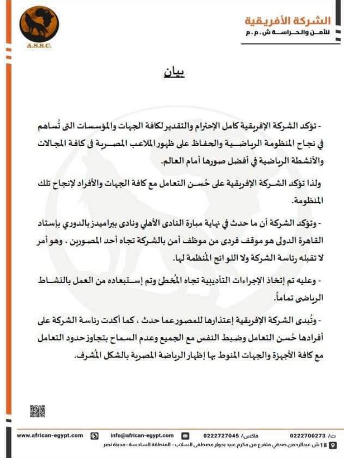 تقدمت الشركة الأفريقية للأمن والحراسة ، باعتذار رسمي إلى مصور مباراة الأهلي وبيراميدز بعد تعرضه للاعتاء من قبل أحد أفراد الشركة عقب المباراة وأثناء تأدية مهام وظيفته المكلف به من جهة عمله.