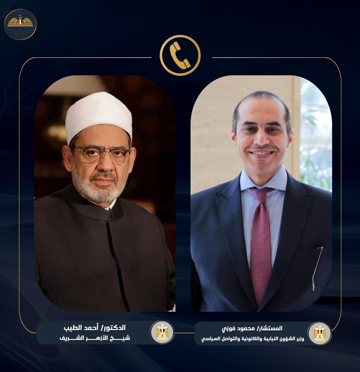 أجرى السيد المستشار محمود فوزي، وزير الشئون النيابية والقانونية والتواصل السياسي اتصالاً هاتفياً مع فضيلة الإمام الأكبر أحمد الطيب شيخ الأزهر الشريف.