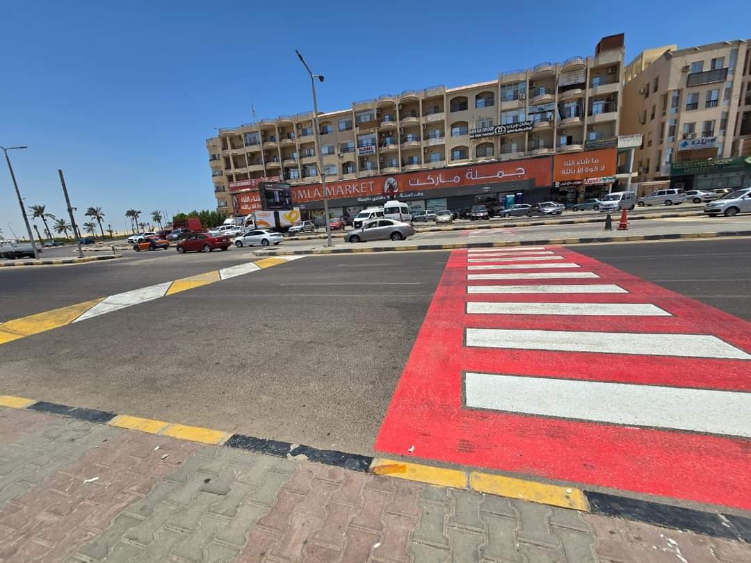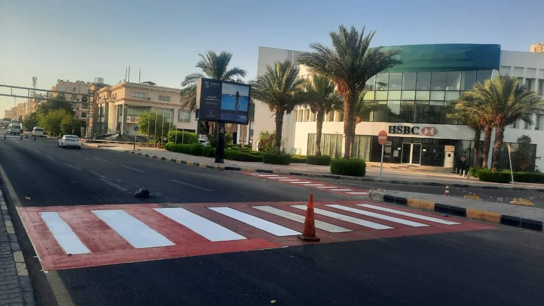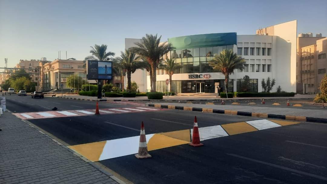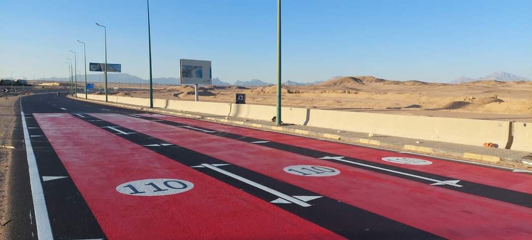 ومن جانبه أوضح النقيب أحمد حمدي رئيس قسم البحوث والتخطيط بمرور البحر الأحمر، أن العمل جارى بشوارع منطقة الكوثر والكمين الجنوبي والممشى السياحي وتم عمل سجادة تغيير السرعات امام سينزومول تجاه طريق كمين المطار ومسار العجل بممشى شمال الأحياء، موضحاً أن المواد المستخدمة ذات طبيعة خاصة تتحمل الاحتكاك ودرجات الحرارة المرتفعة وسرعة الجفاف حتى لا تتسبب في تكدس السيارات وذات قوة التصاق عالية على الاسطح .