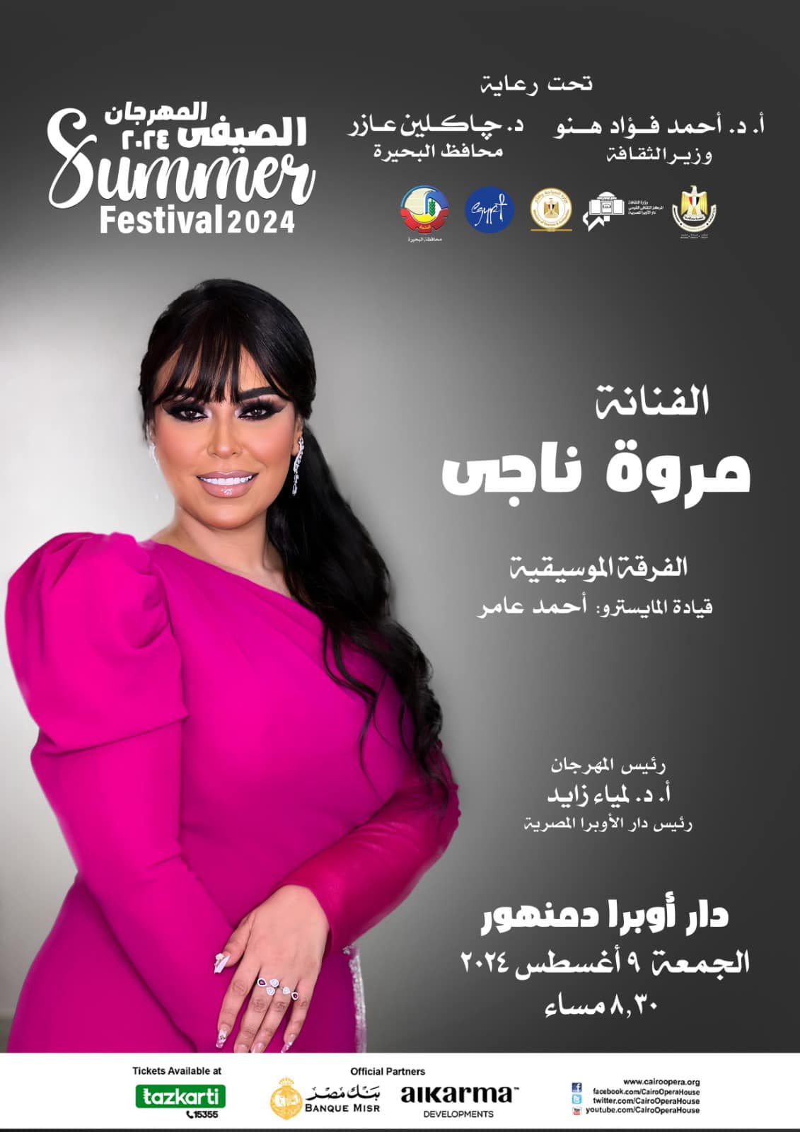 تشارك الفنانة مروة ناجي في فعاليات مهرجان الاوبرا الصفي، المقام في فروعها الثلاث على مستوى الجمهورية، وتضم عدد كبير من نجوم الغناء وأبرز أصوات الأوبرا.