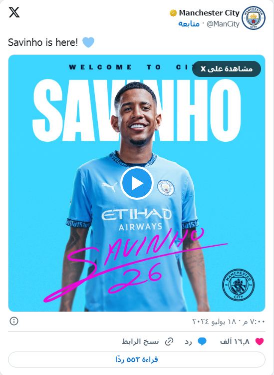 وكشف الحساب الرسمي لنادي مانشستر سيتي، عن ضم سافينيو، اليوم الخميس، كأولى صفقات الفريق السماوي.