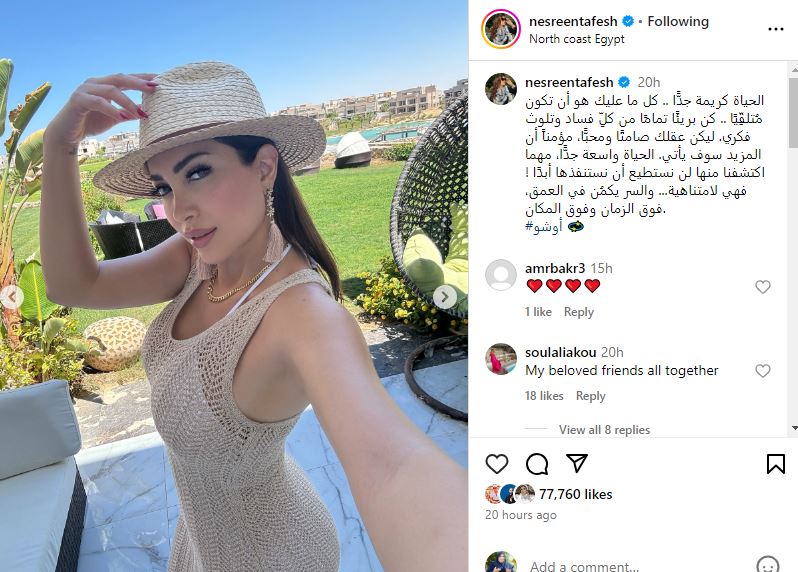 وعلقت على الصور، قائلة: "الحياة كريمة جدًّا، كل ما عليك هو أن تكون مُتلقِّيًا، كن بريئًا تمامًا من كلِّ فساد وتلوث فكري".