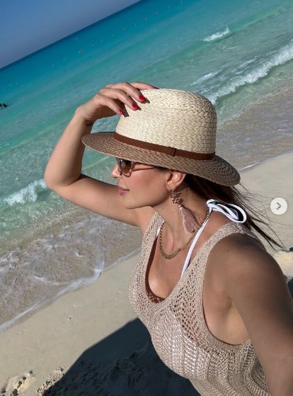 وظهرت نسرين طافش بإطلالة صيفية متناغمة مع اجواء الصيف، حيث ارتدت بكيني باللون الأبيض ونسقت عليه الفستان الكاش مايوه المصمم من الخيوط الناعمة باللون البيج؛ لتواكب أحدث صيحاته عام 2024.