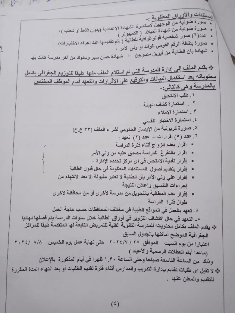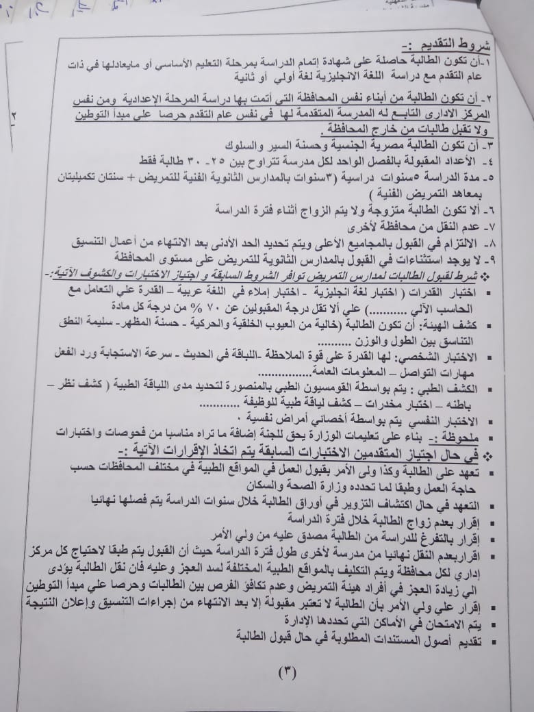 ومن الأوراق المطلوبة تقديم شهادة ميلاد أصلية للطالب و3 صور منها، تقديم عدد 8 صور شخصية 4X6 بشرط أن تكون خلفيتها بيضاء، أصل الشهادة الإعدادية و3 صورة منها، تقديم صورة البطاقة الشخصية الخاصة بولي أمر الطالبة / الطالب، تقديم 6 طوابع مهن طبية، حافظة بلاستيكية، دمغة بـ 1 جنيه، 2 طوابع مهن طبية.