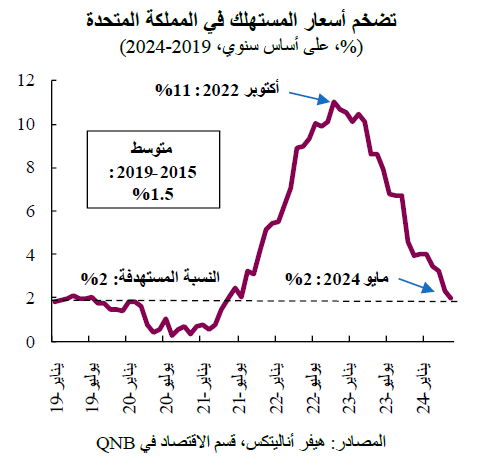 توقع بنك قطر الوطني QNB أن يبدأ بنك إنجلترا مرحلة تخفيض سعر الفائدة في اجتماعه القادم، وسيكون هذا القرار مدعوماً بتراجع التضخم الرئيسي إلى ما دون المستوى المستهدف، وحالة الركود الاقتصادي، والأوضاع المالية المقيدة. ونتوقع أن تكون دورة التيسير تدريجية، ما لم تحدث تطورات اقتصادية كبيرة غير متوقعة، مع تخفيضين إضافيين بمقدار 25 نقطة أساس هذا العام.