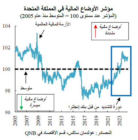 ويشير QNB أن العامل الثالث يتمثل في أن الأوضاع المالية وصلت إلى مستويات مقيدة جداً على خلفية دورة من التشديد النقدي القوي. يوفر مؤشر الأوضاع المالية في المملكة المتحدة ملخصاً مفيداً لأوضاع السوق المالية. يجمع هذا المؤشر بين معلومات أسعار الفائدة قصيرة وطويلة الأجل، وفروق الائتمان. وارتفع المؤشر في النصف الثاني من عام 2023، وهو حالياً عند مستويات لم يتم تسجيلها منذ الأزمة المالية العالمية، عندما أدى الاضطراب الكبير وعدم الاستقرار في الأسواق المالية إلى تجميد الائتمان وتسبب في أزمة مصرفية. وسوف تستمر أسعار الفائدة المرتفعة وبرنامج التشديد الكمي في إبقاء تكاليف الائتمان عالية وسحب السيولة من النظام المالي في المستقبل القريب، حتى بعد بداية دورة تيسير السياسة النقدية. في الواقع، تقلصت أحجام الائتمان بشكل مطرد من حيث القيمة الحقيقية لأكثر من عام. وكلما طال الوقت الذي يستغرقه بنك إنجلترا لتخفيف السياسة النقدية، كلما زادت فرص حدوث اضطرابات مالية. بعبارة أخرى، أصبح التيسير النقدي ضرورياً أيضاً للحد من الضعف المالي الذي تعاني منه البلاد.