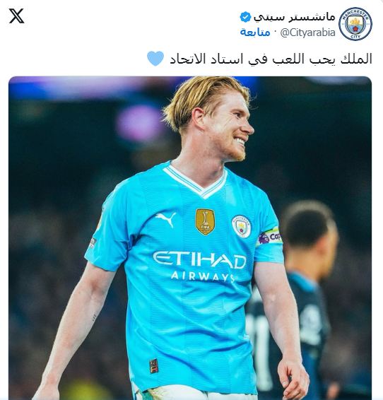 نشر الحساب العربي لنادي مانشستر سيتي عبر منصة "إكس"، صورة للبلجيكي كيفين دي بروين وكتب في تعليقه: "الملك يحب اللعب في استاد الاتحاد".