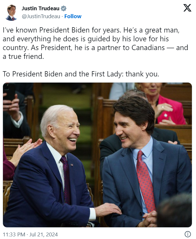 وقال جوستين تريدو عبر صفحته الرسمية بموقع التواصل الإجتماعي “إكس” : “ لقد عرفت الرئيس بايدن منذ سنوات، إنه رجل عظيم، وكل ما يفعله يسترشد بحبه لبلاده، وهو دائما ما يكون شريك للكندينوصديق حقيقي ” .
