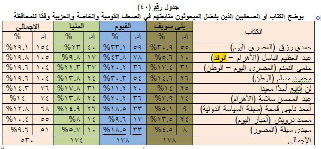 كما أوضحت نتائج الدراسة حصول الكاتب حمدي رزق الصحفي بالمصري اليوم والوفد على أعلى درجة متابعة من قبل المبحوثين حيث يفضل 29.1% من جمهور إقليم شمال الصعيد قراءة مقالاته وموضوعاته، يليه يأتي الصحفي عبد العظيم الباسل الكاتب بجريدتي الأهرام والوفد بنسبة 19.8% والذي تصدر القائمة في محافظة الفيوم وبفارق بسيط يأتي كل من الكاتبين حلمي النمنم الكاتب بالمصري اليوم والوطن ومحمود مسلم رئيس مجلس إدارة الوطن بنسبة 19.6% يليهم من لا يتابعون أحدًا معينًا بنسبة 14.3% ثم الكاتب الصحفي عبد المحسن سلامة بنسبة 14%، وحصل الكاتب الصحفي أحمد ناجي قمحة بنسبة 12.8% بينما حصل الكاتب محمد درويش على نسبة 10.4% فيما جاء الكاتب الصحفي مجدي سبلة في المرتبة الأخيرة بنسبة 9.6%.