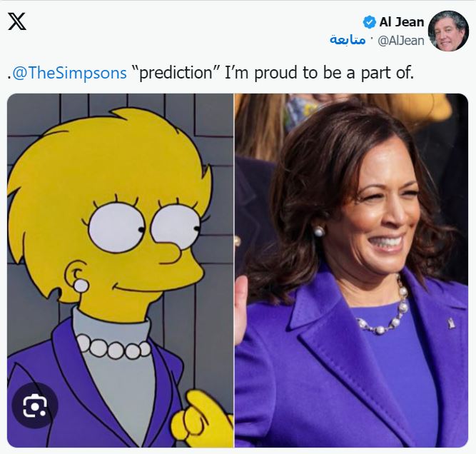 وفقًا لصحيفة الإندبندنت البريطانية، تعود هذه اللقطات إلى حلقة من الموسم الحادي عشر، تحمل عنوان بارت إلى المستقبل، حيث ظهرت فيها شخصية ليزا سيمبسون بعد توليها منصب رئاسة الولايات المتحدة، مرتدية ملابس شبيهة بملابس كامالا هاريس التي ارتدتها خلال حفل تنصيب الرئيس الأميركي جو بايدن في عام 2021.