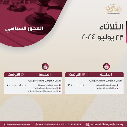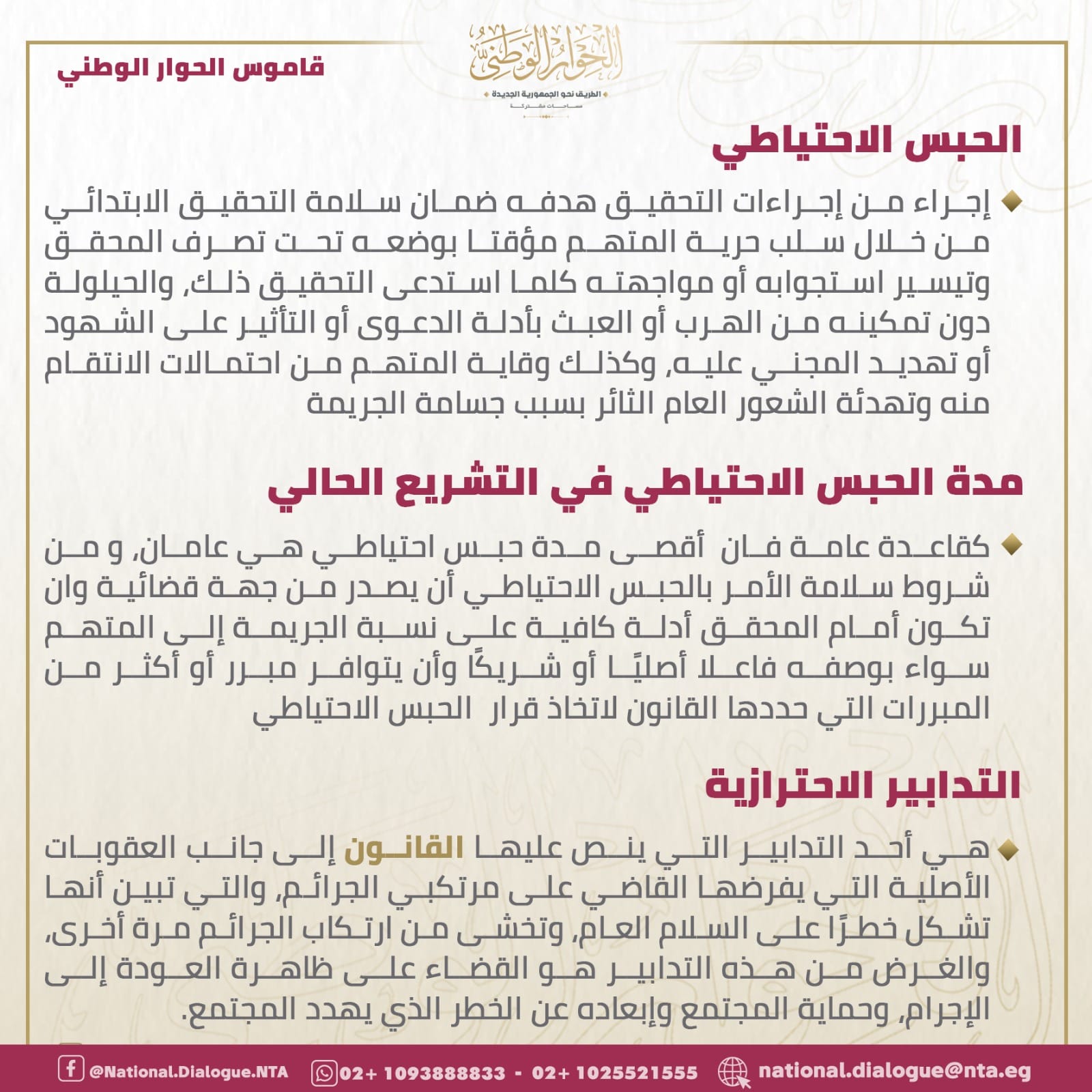 ويولي مجلس أمناء الحوار الوطني اهتماماً بالغاً لمناقشة قانون الإجراءات الجنائية لمعالجة ملف الحبس الاحتياطي من أجل ضمان محاكمة عاجلة ومنصفة والحفاظ على حقوق الإنسان بما يضمن توحيد الجهود الوطنية للارتقاء بوضع المواطن المصري وتعزيز حقوقه وتحقيق تكافؤ الفرص على أرض الوطن.