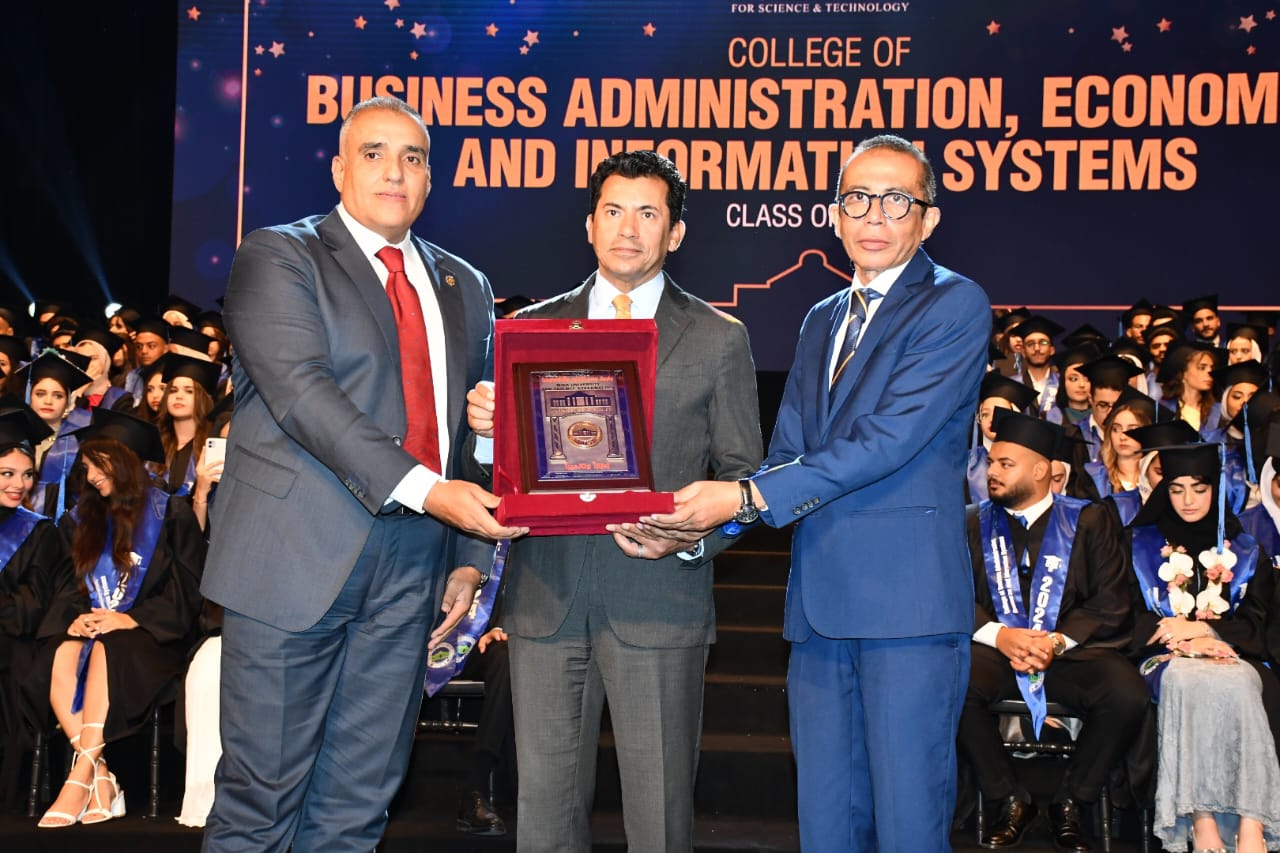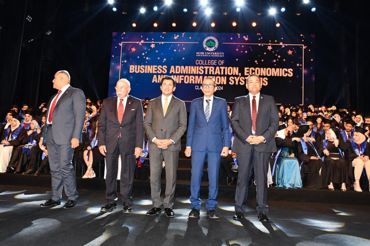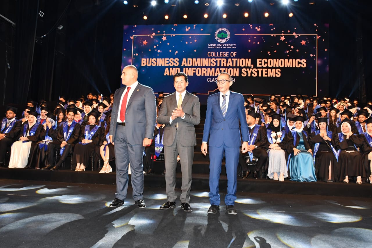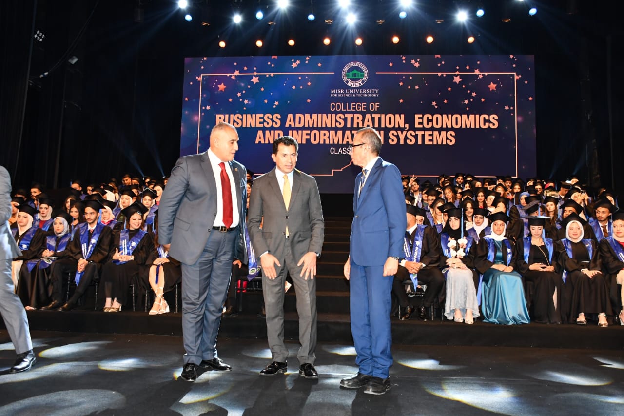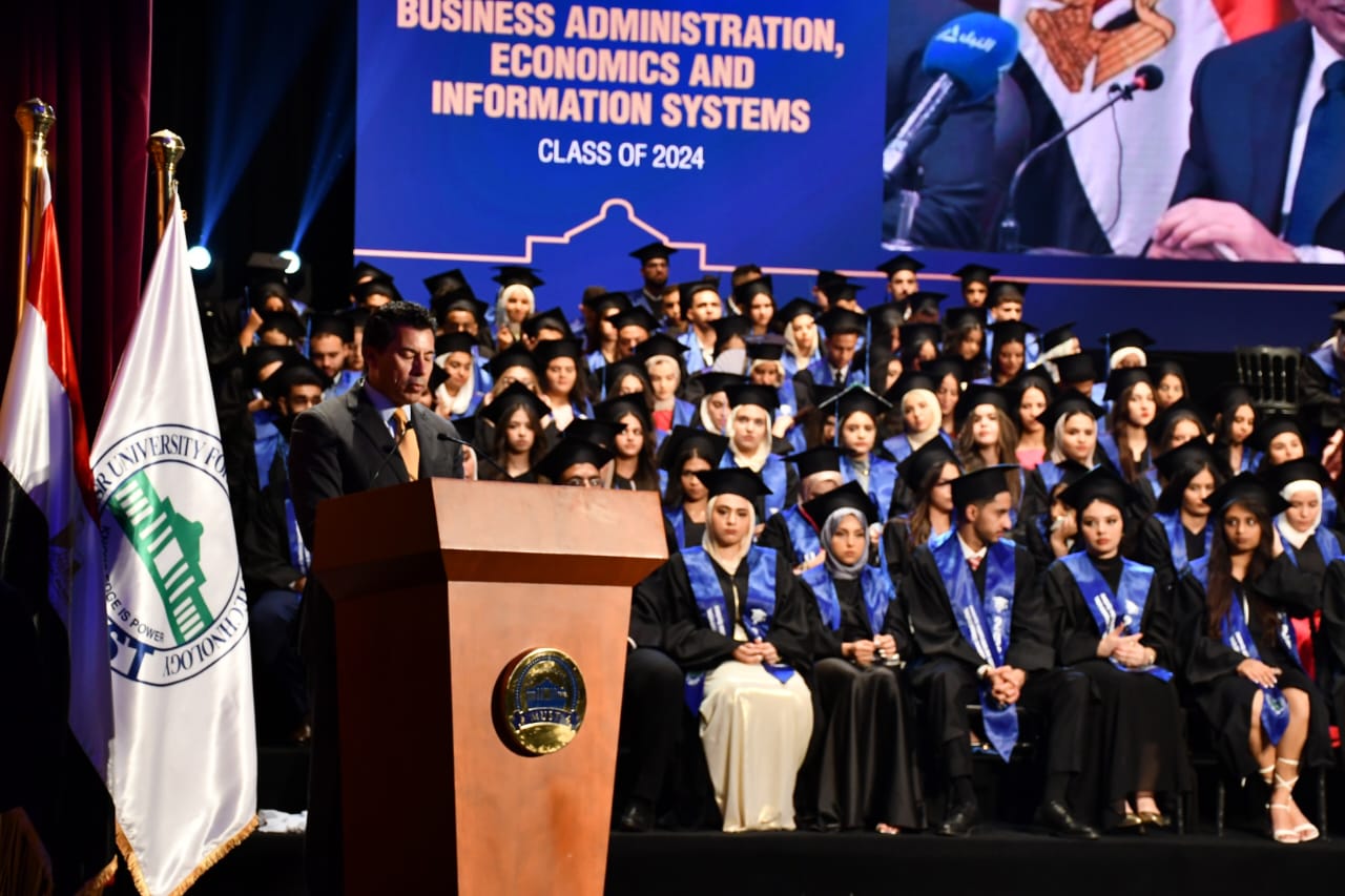 شهد الدكتور أشرف صبحي، وزير الشباب والرياضة، والدكتور نهاد المحبوب، القائم باعمال رئيس جامعة مصر للعلوم والتكنولوجيا، حفل تخريج شباب كلية الادارة والاقتصاد ونظم المعلومات بجامعة مصر، بحضور المهندسة غادة لبيب، نائب وزير الاتصالات وتكنولوجيا المعلومات للتطوير المؤسسي، الدكتور كمال درويش، رئيس اللجنة العلمية بوزارة الشباب والرياضة، والنائب محمد عمارة، امين سر لجنة الشباب والرياضة بمجلس الشيوخ، ولفيف من الاساتذة وعمداء جامعة مصر للعلوم والتكنولوجيا.