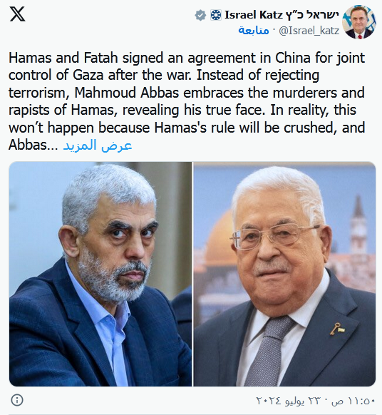وكتب كاتس في منشور عبر حسابه على منصة "إكس": "وقعت حماس وفتح اتفاقا في الصين للسيطرة المشتركة على غزة بعد الحرب. بدلا من رفض الإرهاب، يحتضن (الرئيس الفلسطيني) محمود عباس قتلة حماس ومغتصبيها، ويكشف عن وجهه الحقيقي".