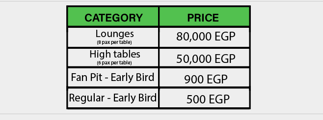 قُسمت أسعار التذاكر إلى 4 فئات: الأولى 500 جنيه، الثانية 900 جنيه، الثالثة 50 ألف جنيه (9 أفراد)، 80 ألف جنيه (8 أفراد).