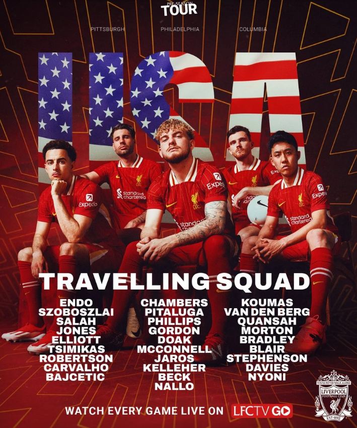 قائمة ليفربول المشاركة في معسكر الولايات المتحدة الأمريكية، تواجد النجم محمد صلاح وغياب أبرز اللاعبين الأساسين مثل ترينت ألكسندر أرنولد، داروين نونيز، لويس دياز، جو جوميز، أليكسيس ماك أليستر.