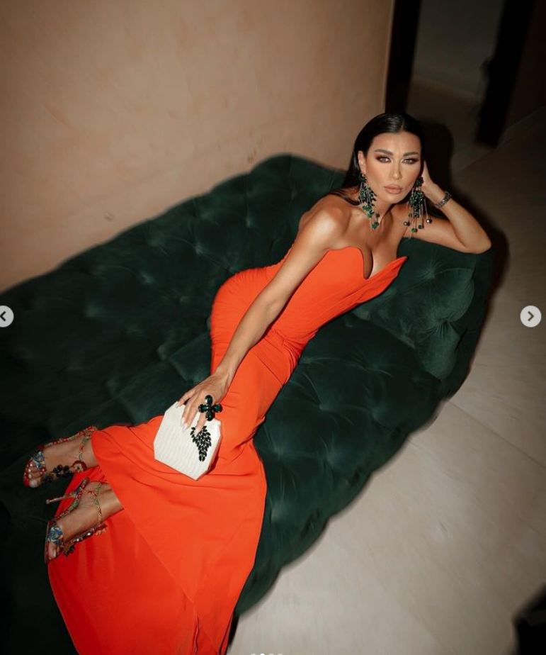 وأختارت نادين الراسي فستان طويل مجسم، ينتمي لقصة الكب مع الأشكال الهندسية من الأمام، لتواكب موضة ربيع وصيف 2024-2025، صمم من قماش الكريب باللون البرتقالي الغامق، الفستان حمل توقيع مصمم الأزياء اللبناني أنطوان قارح، الإطلالة من أختيار خبير الموضة zakissa.