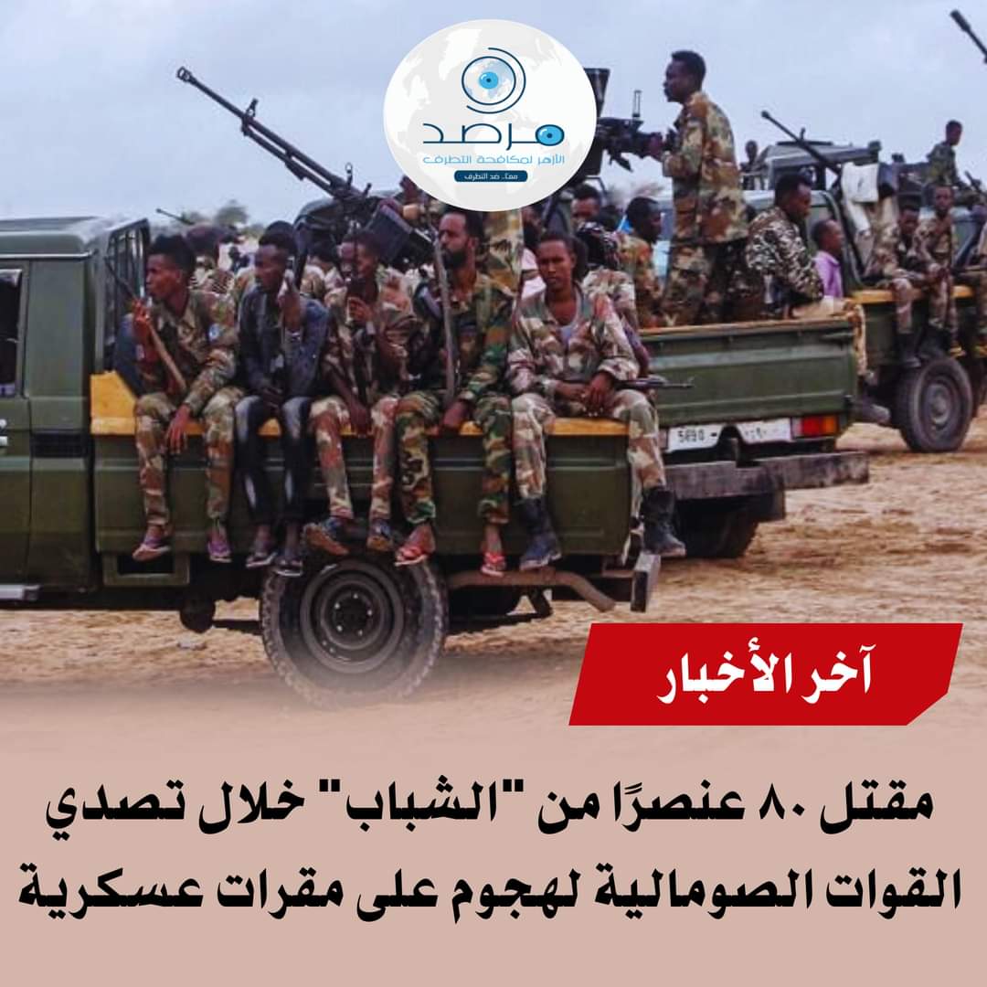 قال مرصد الأزهر إن أفادت وسائل إعلام محلية بأن أكثر من 80 عنصرا من حركة الشباب الإرهابية قتلوا في عملية عسكرية مشتركة نفذها الجيش الوطني بالتعاون مع قوات إقليم جوبالاند الواقع في جنوب الصومال، وذلك بعدما هاجم عناصر الحركة قواعد الجيش في كل من: بولو حاجي، وبار سنغوني، وهربولي بمحافظة جوبا السفلى.