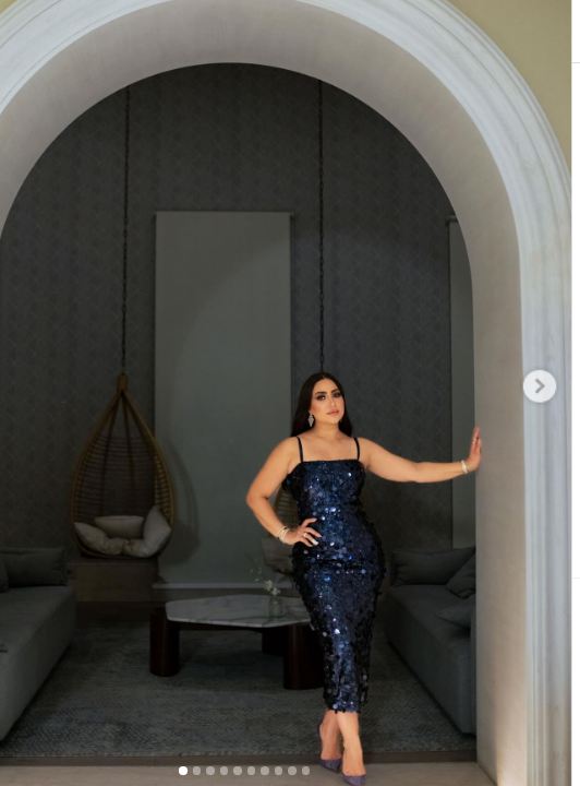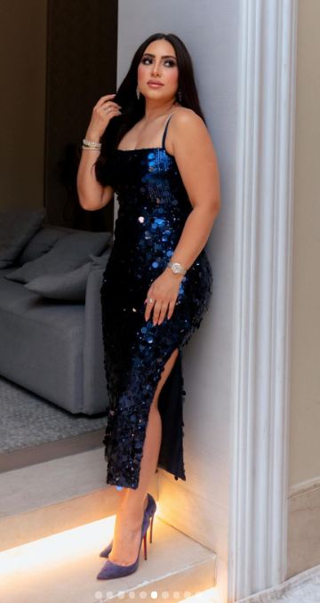 وظهرت بوسي بإطلالة لامعة، مواكبة لموضة فساتين السهرة 2024-2025، وارتدت فستان مجسم، قصير، صمم من قماش الترتر باللون الكحلي أتسم بشق مثير كشف عن أحد ساقيها والفستان عكس قوامها الكمثري دون الميل للجرأة، فيما انتعلت حذاء بكعب عال بنفس لون الفستان.