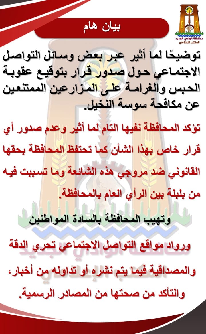 نفت محافظة الوادي الجديد، في بيان لها، الأخبار المتداولة عبر منصات التواصل الاجتماعي “فيسبوك”، حول صدور قرار بتوقيع عقوبة الحبس والغرامة على المزارعين الممتنعين عن مكافحة سوسة النخيل.