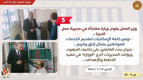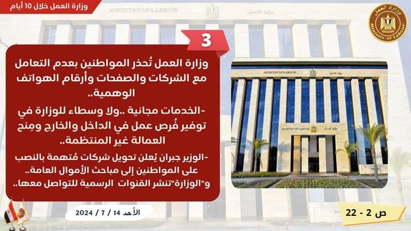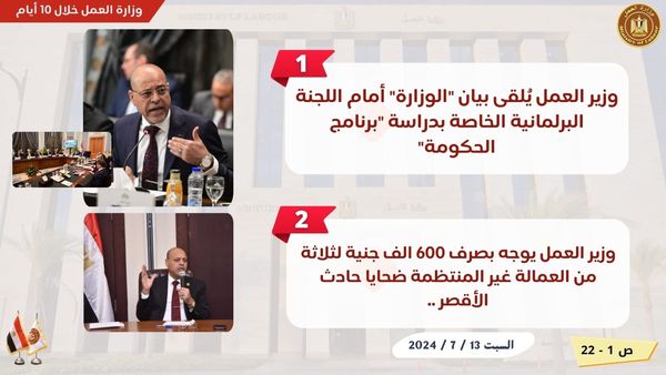 نشرت وزارة العمل اليوم الأربعاء "إنفوجراف " بشأن نشاط "الوزارة " خلال 10 أيام ماضية ،حيث بدأت هذه الفترة بإلقاء وزير العمل محمد جبران "بيان الوزارة " أمام اللجنة البرلمانية المختصة بمناقشة بيان "الحكومة الجديدة" ،ليعرض خارطة طريق "العمل" خلال الفترة المقبلة.