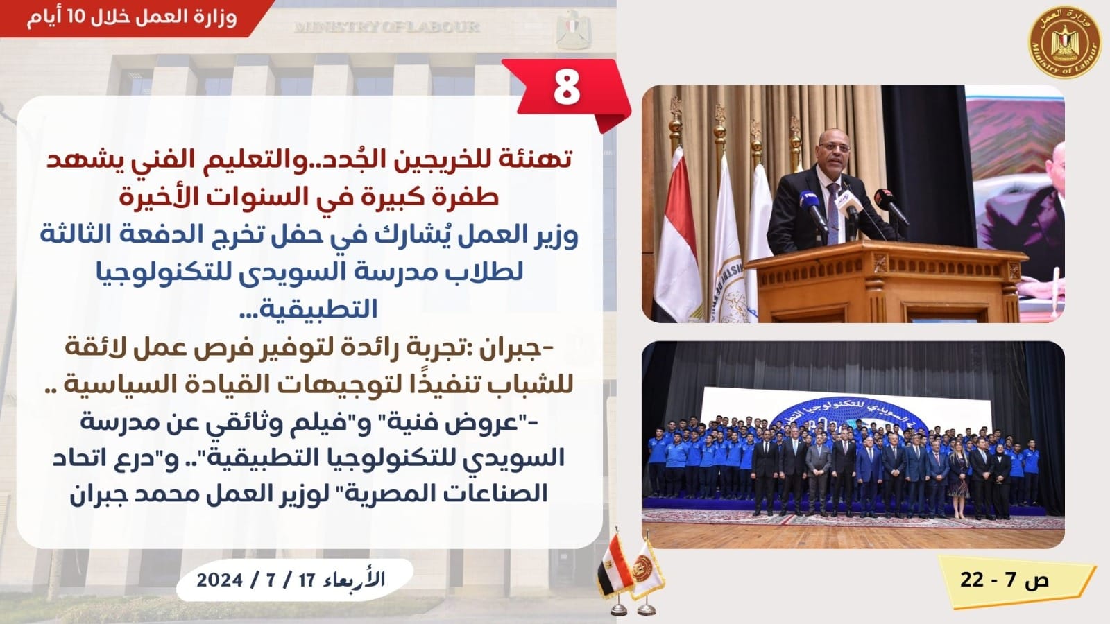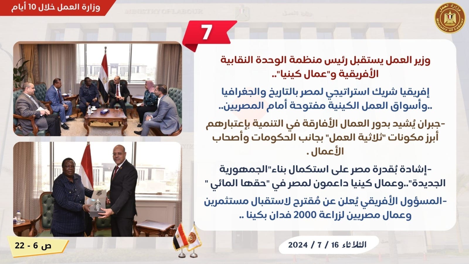 وكانت هناك 10 توجيهات واجبة التنفيذ إلى مديرية مديريات العمل بالمحافظات ،للقيام بدورهم في تقديم الخدمات للمواطن بشكل لائق وكريم ،ومراقبة تطبيق قوانين وقرارات العمل داخل المنشآت..وكذلك توجيهات إلى مكاتب التمثيل العمالي بالخارج ،بتكثيف الجهود بالتواجد وسط العمالة المصرية والجاليات هناك ..لقاءات عربية وإفريقية ودولية ،لتعزيز التعاون ،وتنفيذ الخطط والبرامج المشتركة..كما كان ملف تطوير منظومة التدريب المهني ،لصناعة مواطن مصري ماهر ومدرب قادر على التجاوب مع متطلبات سوق العمل في الداخل والخارج ،أبرز اهتمامات الوزير جبران ،في عدد من اللقاءات خلال الفترة المذكور .