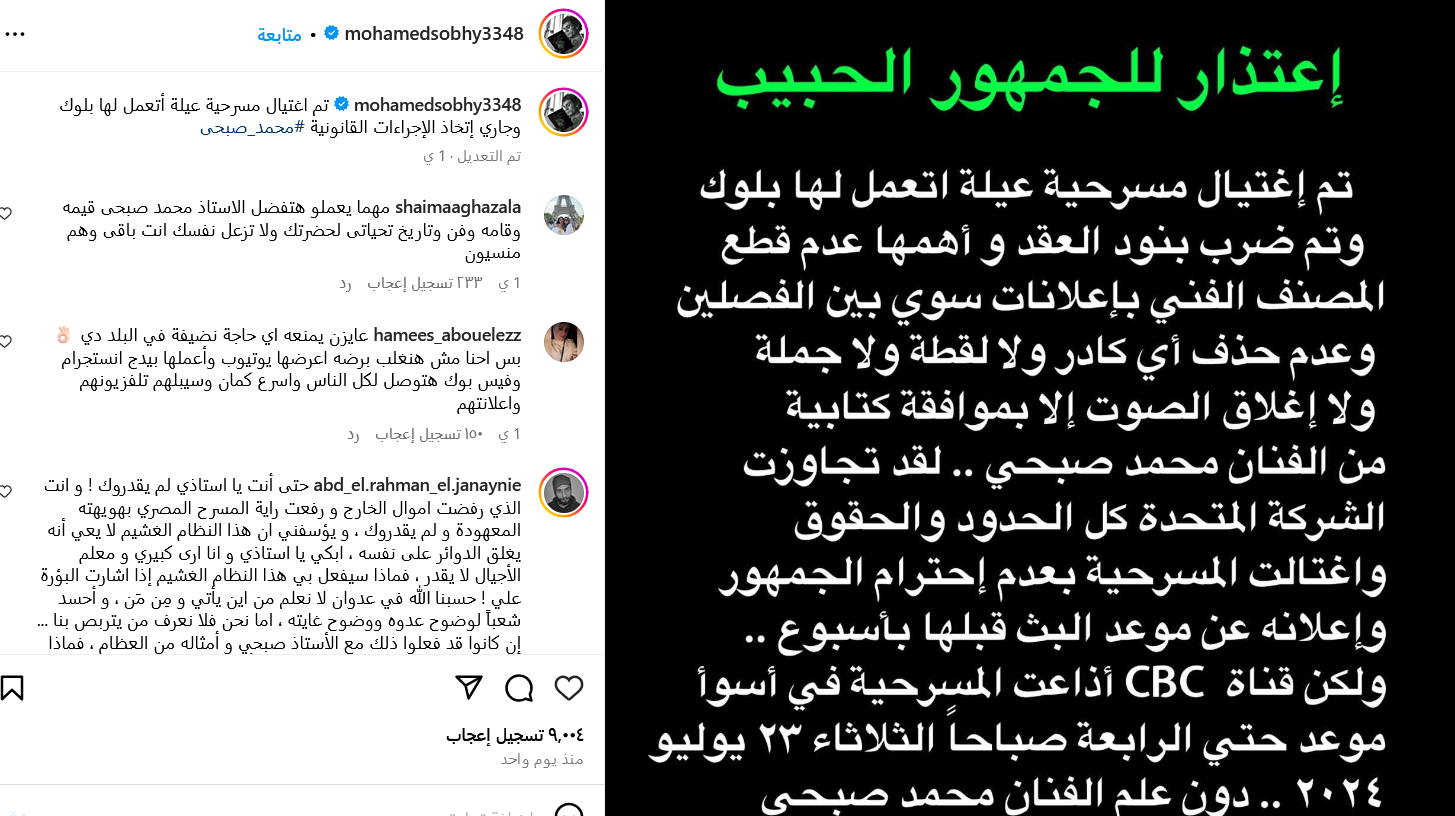 واستكمل قائلًا: ولكن القناة أذاعت المسرحية في أسوأ موعد، حتى الرابعة صباحًا الثلاثاء 23 يوليو 2024، دون علم الفنان محد صبحي»، وعلق على المنشور قائلاً:: وجاري اتخاذ الإجراءات القانونينة".