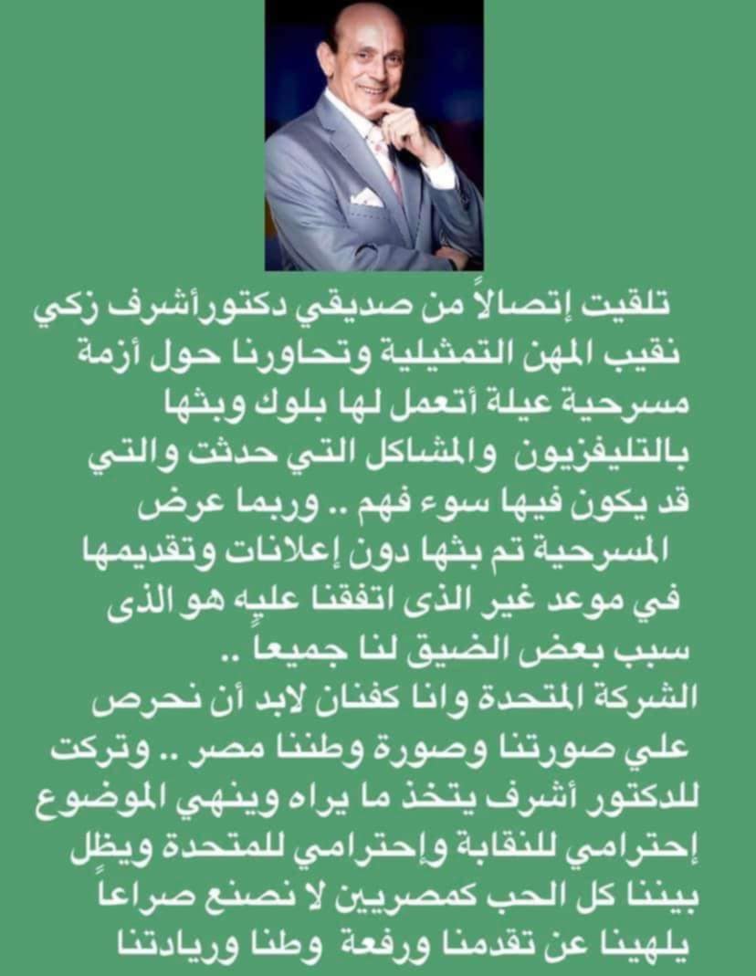 وجاء الختام "تركت للدكتور أشرف أن يتخذ ما يراه وينهي الموضوع.. احترامي للنقابة واحترامي للمتحدة ويظل بيننا الحب كمصريين لا نصنع صراعًا يلهينا عن تقدمنا ورفعة وطننا وريادتنا».