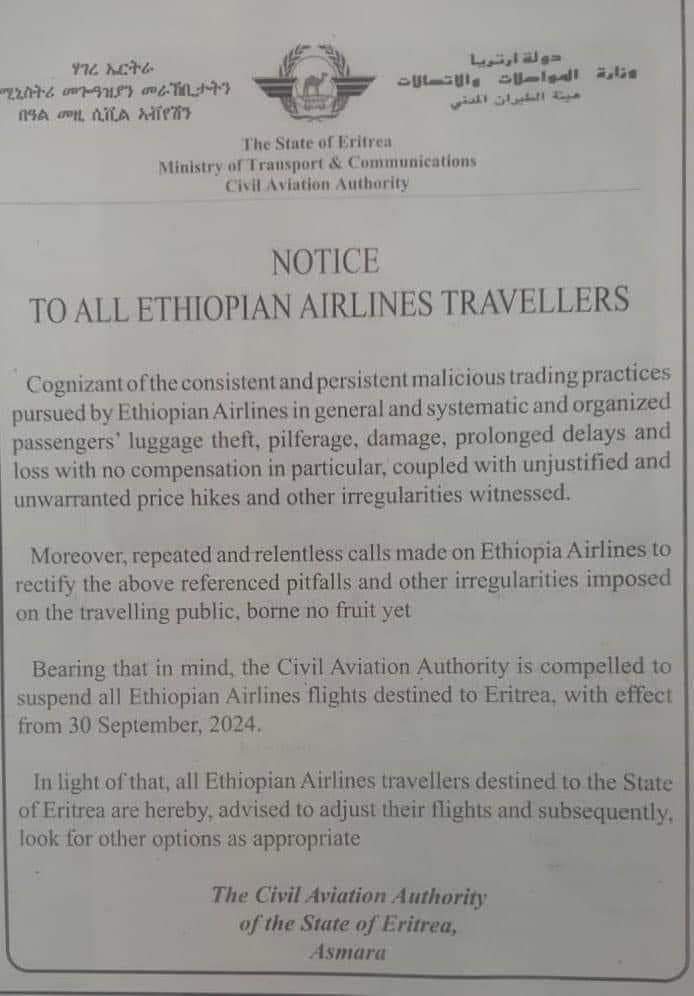 انتشر خلال الساعات القليلة، عبر منصات التواصل الاجتماعي "فيسبوك واكس"، وثيقة تفيد بأن هيئة الطيران المدني في إريتريا، علقت جميع رحلات الخطوط الجوية الإثيوبية المتجهة إلى إريتريا، اعتبارًا من 30 سبتمبر 2024.