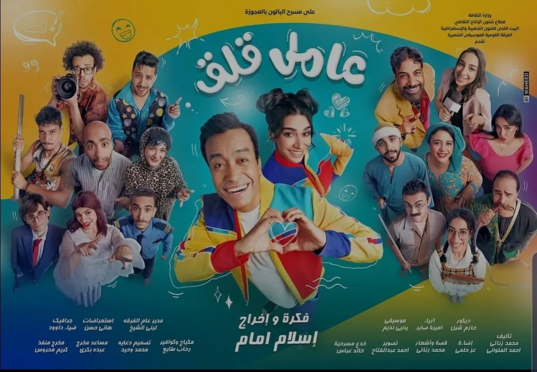 مسرحية "عامل قلق" تأليف محمد الزناتي، أحمد الملواني، ديكور حازم شبل، ألحان يحيى نديم، إضاءة عز حلمي، استعراضات هاني حسن، جرافيك ضياء داوود، أزياء أميرة صابر، مخرج منفذ كريم محروس، فكرة وإخراج إسلام إمام، ومن إنتاج الفرقة القومية للموسيقى الشعبية بقيادة الفنانة لبنى الشيخ.
