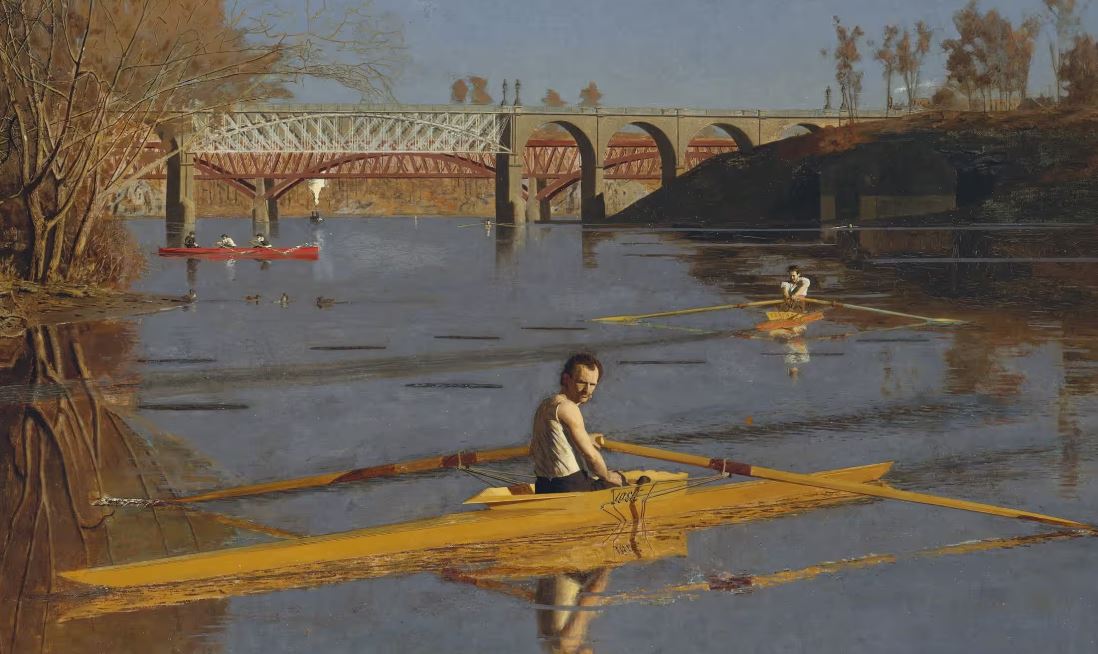 تدور العديد من صور الرياضة، بدءًا من لوحة رامي القرص فصاعدًا، حول الحركة والطاقة، لكن هذه اللوحة تلتقط لحظة من الراحة. يتوقف هذا المجدف المنفرد، في عمل فرعي بعنوان ماكس شميت في مجداف واحد، على الماء الراكد. يلتقط إيكينز اللحظة بدقة وهدوء خارقين، من السماء المتجمدة إلى الانعكاسات الشبيهة بالصور الفوتوغرافية والعزلة الفلسفية للمجدف الشاحب.