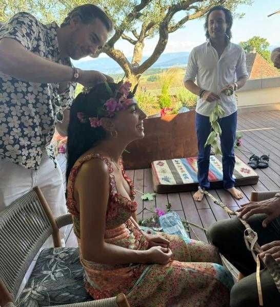 وجلس الثنائي على كرسيين متقابلين بينما أحاط بهما الأصدقاء، وتم نثر الورود على الأرض من حولهما، فيما كان الزوج يحمل في يده عصا خشبية، وأمسكت سلمى وإدريس بمجموعة من الخيوط التي تصل جميع الحضور ببعضهم البعض، وبدا المشهد كأنه طقوس احتفالية من نوع ما، ربما خاصة بالدولة التي تتواجد فيها سلمى حاليا. ليتسائل رواد السوشيال عن كنه تلك الطقوس دون رد من الفنانة حتى الآن.