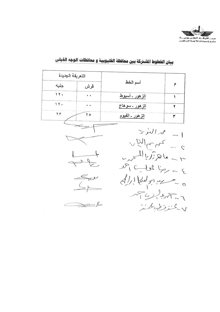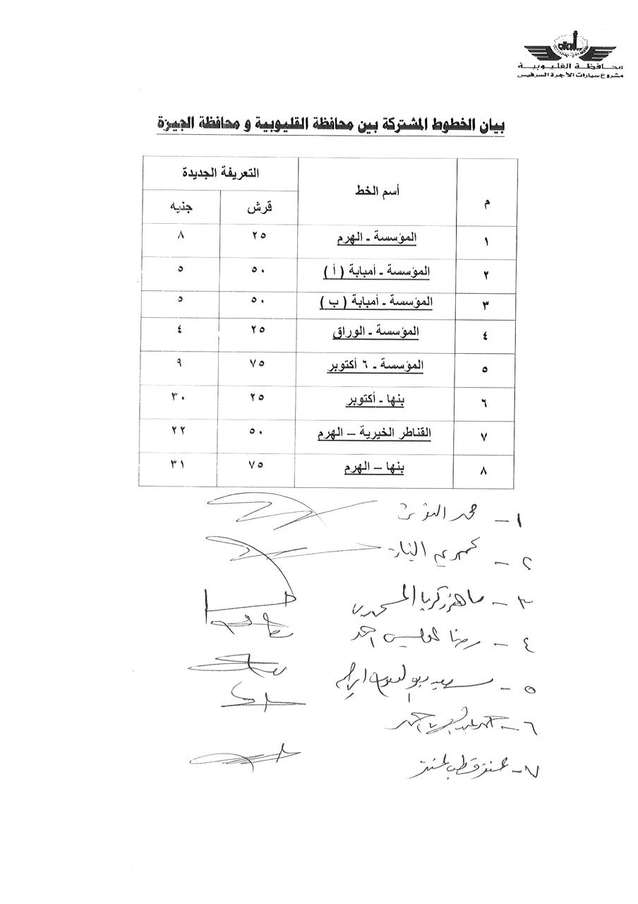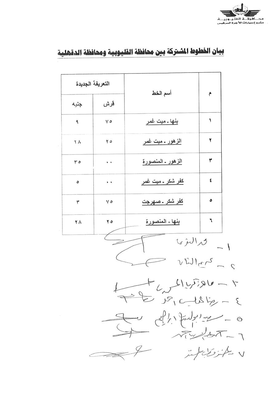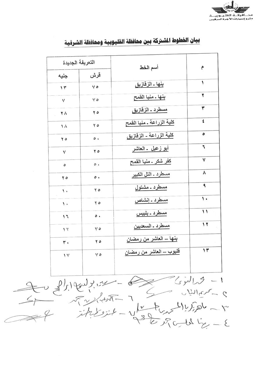 أصدر اليوم المهندس ايمن عطيه محافظ القليوبية قرار رقم (720) لسنة 2024 الخاص بتعديل التعريفة الجديدة والمقررة لركوب سيارات الأجرة والسرفيس بدائرة المحافظة ، وذلك علي إثر زيادة أسعار البنزين والسولار الذي أقره وزير البترول والثروة المعدنية.